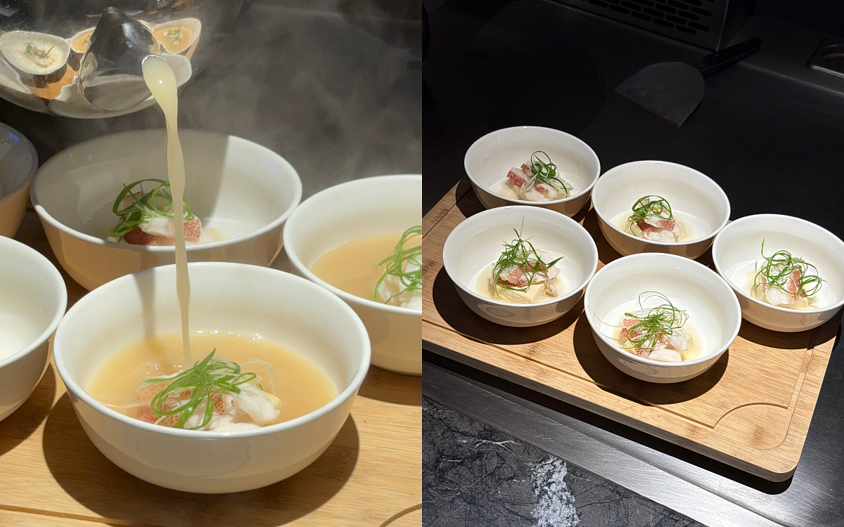 本季採用新鮮龍膽魚骨為熬湯底主材料,湯底味道濃郁,加入薄透新鮮紅條魚片以滾熱的魚湯涮煮,突顯魚片本身的鮮甜,最後加入現炸香米,提升湯頭層次與口感。
