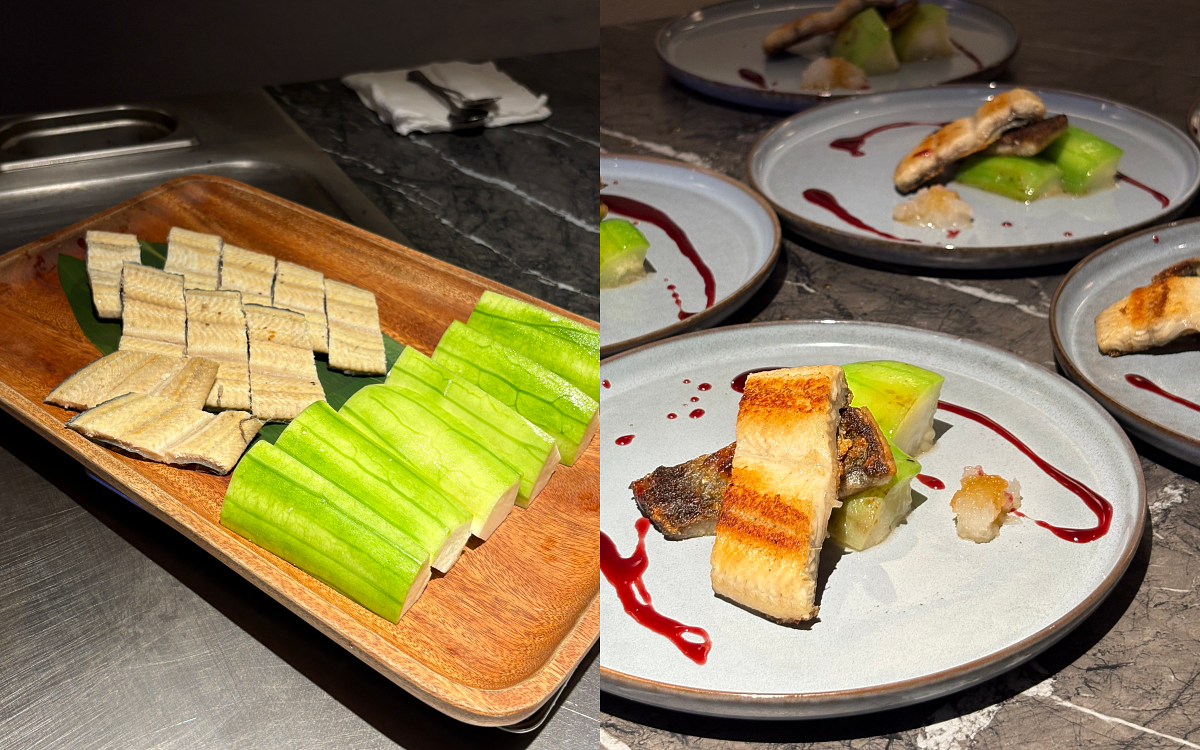 利用鐵板高溫均勻受熱的優勢將其皮面煎至極酥的口感,並僅用鹽巴提味,保留鰻魚最原始的鮮甜風味與魚肉嫩度,搭配主廚特製的蛋黃海鹽及仙人掌果醋,鹹香解膩爽口。