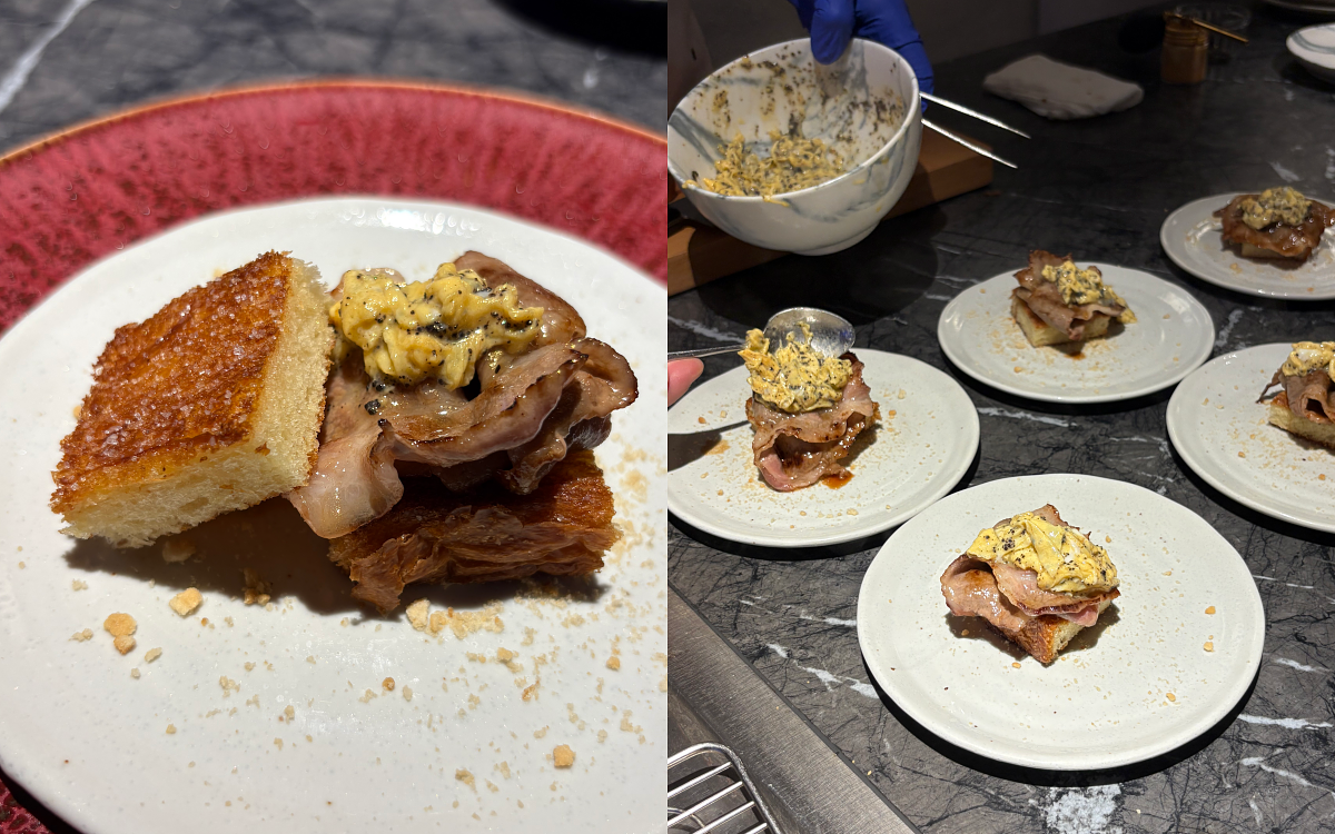 選用 Iberico 伊比利豬, 肉質油花細嫩並選用 Purebread 布里歐土司,以奶油煎香後,搭配松露滑蛋,整體口感香氣提升。