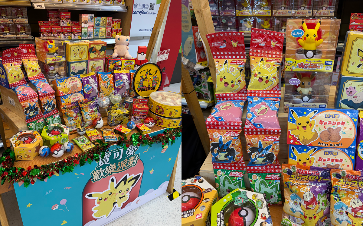家樂福寶可夢歡樂派對,眾多寶可夢齊聚一堂,家樂福販售超過100款寶可夢商品,宛如小型的寶可夢商品展,從可愛造型燈球、萌萌罐、公仔、包件、零食餅乾巧克力一應俱全。