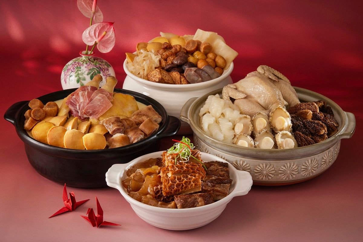內含:新歲輕盈青花筍、大桔大利酸辣蝦、金來棗開運肋排、海派大團圓燉飯、海陸鮮爆金湯鍋