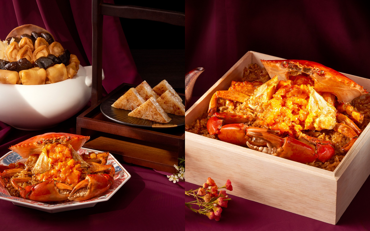 館內宴會廳亦為除夕團圓時刻打造「即食熱年菜」外帶套餐,適合四人享用。前菜「龍馬精神開運集」匯集烏魚子、鳳尾蝦、沙薑嫩皇雞等五款精緻小品,象徵新春開運迎吉。燒臘主廚匠心烤製的「魚子醬金牌掛爐鴨(半隻)」外皮金黃酥香,一口咬下鮮嫩多汁,鴨脂香氣四溢,是宴席上的必嚐亮點。粵菜經典「老港味糯米炒蟹」先拆膏蒸熟,再以高溫油炸鎖住肉汁,並將蟹膏油泡至八分熟,最後以蟹高湯與蠔油炊煮糯米,香氣誘人。冬季必備的中式湯品「豐年滿盅醃篤鮮」 經長時間細火熬煮,乳白湯色凝聚層層精華,鹹鮮濃郁、暖心暖胃。接續以頂級鮑汁煨煮的「翡翠鮑汁吉品鮑燒賣」,以及融合魚肉鮮美、辣椒香辣與肉鬆鹹香的「紅袍燒椒肉鬆龍虎斑」為宴席增添豐盛亮點。最後以奶香馥郁、口感清爽的「鴻運生乳卷」劃下甜蜜句點,為團圓時刻妝點滿滿幸福滋味。