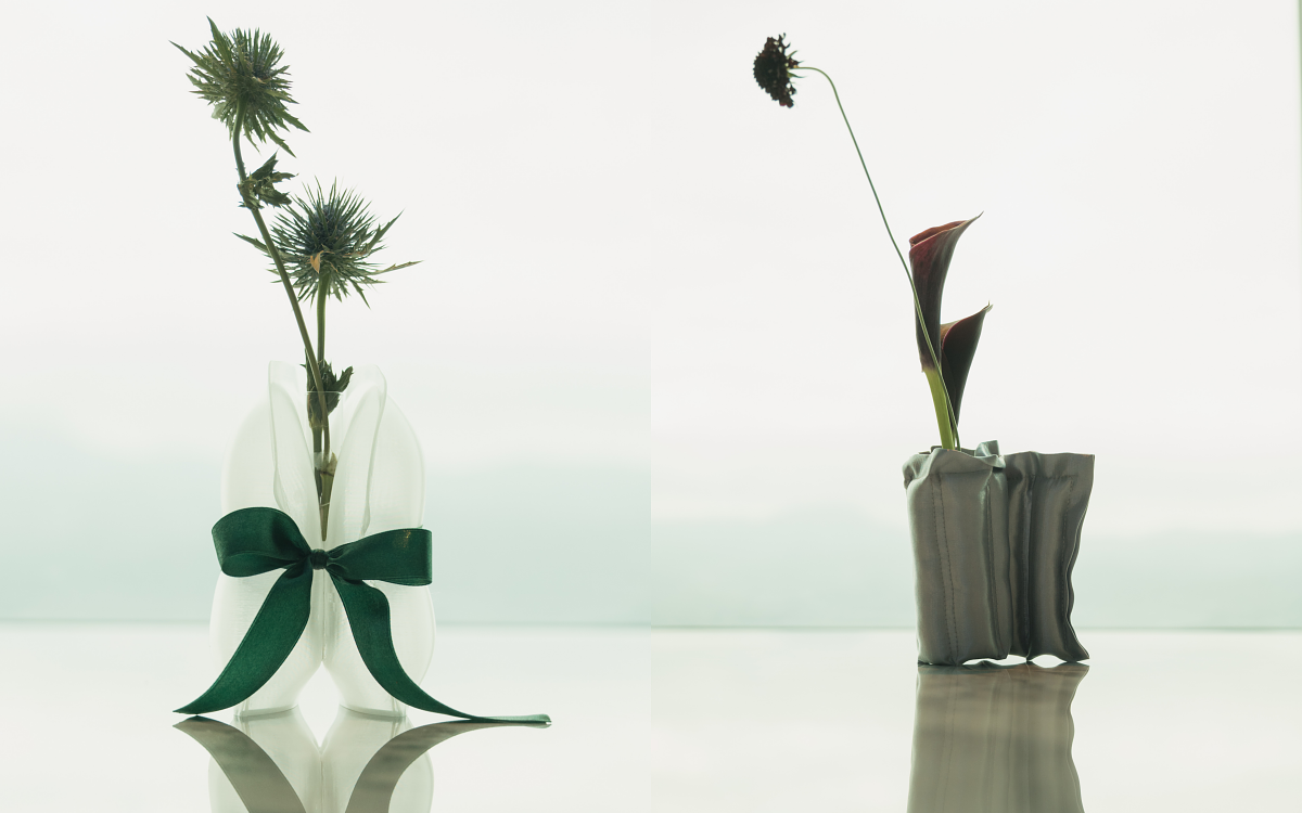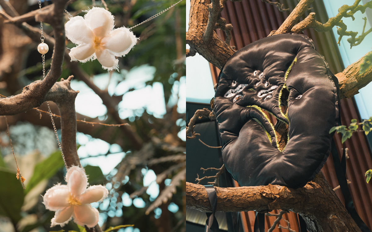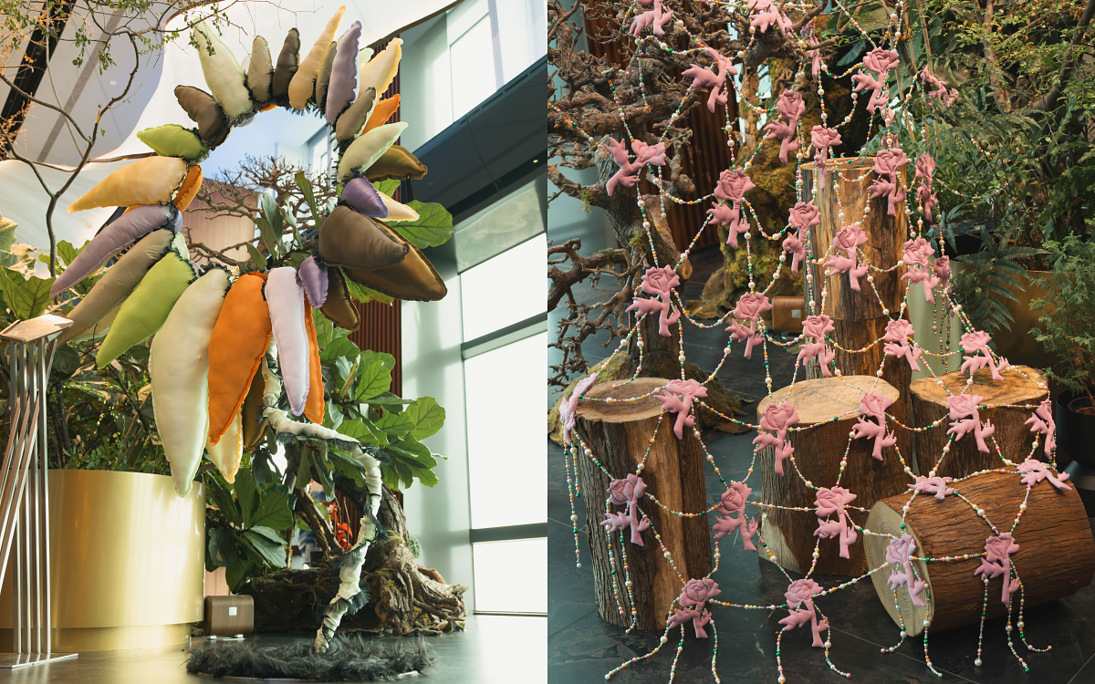 陳聖文以布料、金屬、膠膜與緞帶等媒材,打造出結合牡丹、蘭花、向日葵與梅花意象的超現實花園。放大比例的花朵綻放於饗 A Joy 的大廳入口處,與多物種植栽情境空間互為呼應,以鮮豔色彩與奇幻質地營造夢境般的沉浸體驗,映照出台灣文化的多樣能量。桌上裝置則延續「花卉」為靈感,運用回收塑膠瓶抽絲再製成透明纖維,透過 3D 列印化為花瓶容器,並搭配 CN Flower 的選花共同呈現。輕盈的線條象徵「延續」與「重生」,讓原本的廢棄物獲得全新的生命。希望在年年末之際來訪的此刻,賓客能於這座花園中感受不一樣的節慶——在藝術與美食交織的體驗裡,重新思考生活的形式與美的永續。
