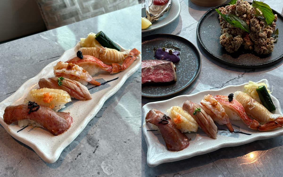 精準火候勾勒食材鮮甜,使用飽滿的台東關山米製成的37.5度溫醋飯,呈現細緻而俐落的高空鮨味。