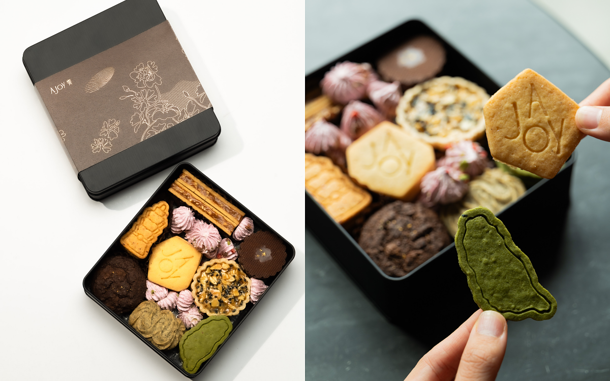 饗 A Joy 的『寶島臻選餅乾禮盒』從藝術到味覺,延續創作語彙中「祝福」的精神,讓歲末的每一次相聚都成為一場味覺與感官的慶典。節慶限定禮盒延續〈採花 Gathering Blossoms〉的概念,從藝術家的作品中擷取花卉與贈禮意象,轉化為可品嚐的「味覺風景」。饗 A Joy 以「風土、形象與情感的延續」為題,將台灣在地食材、建築語彙與節慶氛圍融入餅乾設計,讓一盒餅乾成為島嶼文化的縮影——從視覺造型到味覺層次,都承載著祝福與記憶。