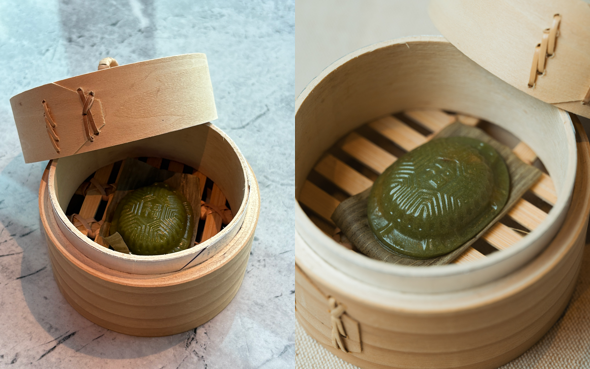 這次推出的兩道料理,皆以地瓜為靈魂。第一道〈炙烤肋眼牛排佐煙燻紫薯〉,以墨西哥料理為靈感,結合台灣風土氣息,轉化為充滿暖意的冬季風景。油花細緻的爐烤肋眼牛排,搭配有著煙燻香氣的台農 73 號紫地瓜泥,與日式柚子汁調和的柑橘酸奶帶出明亮酸韻,再以芝麻、二荊條與花椒熬製的辣油收尾,層層辛香中透出節慶般的熱度。第二道〈地瓜草仔粿〉則呼應記憶中的草仔粿,饗 A Joy 以地瓜葉汁與油蔥酥揉進外皮,包入台農57號黃地瓜的內餡——鹹香交錯、餘韻溫柔 。