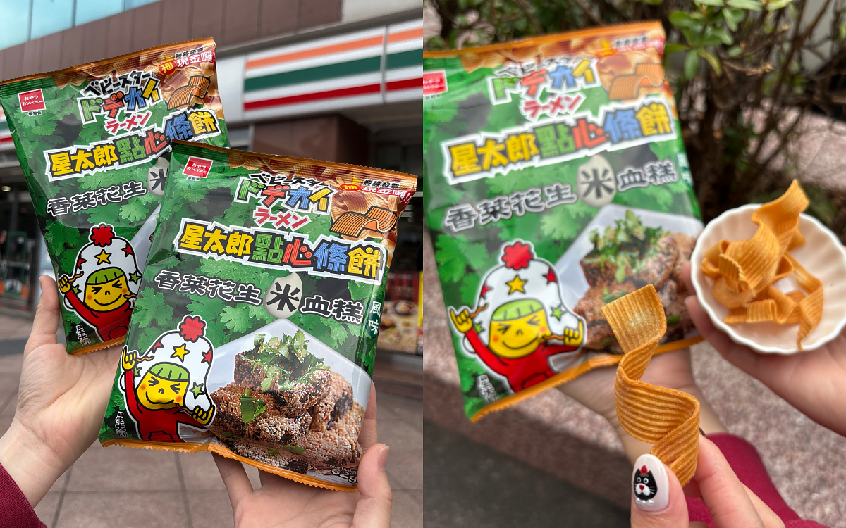 連點心麵也加入這波香菜戰局!把「香菜、花生、米血糕」通通加入寬版點心麵裡。一開袋就聞到濃郁的香菜氣息,以及強烈的花生粉香氣,嚐起來也是風味層次豐富,卻不違和。這次更是採用米製的餅體,口感上更加酥脆!