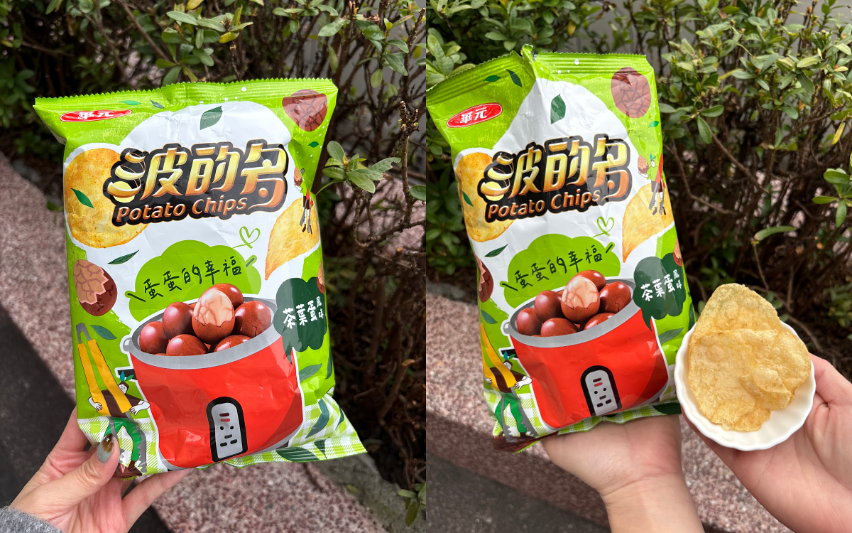 跟上各式各樣的蛋口味洋芋片之後,波的多也推出了「茶葉蛋」口味的洋芋片。開袋就能明顯感受到醬香及滷汁的氣味,很像是站在超商夾茶葉蛋中的撲鼻香。一口咬下其實沒有聞起來那麼豐富的味道,是款基本風味的零食,淡淡鹹香、越咬越香,很適合搭配茶飲追劇。