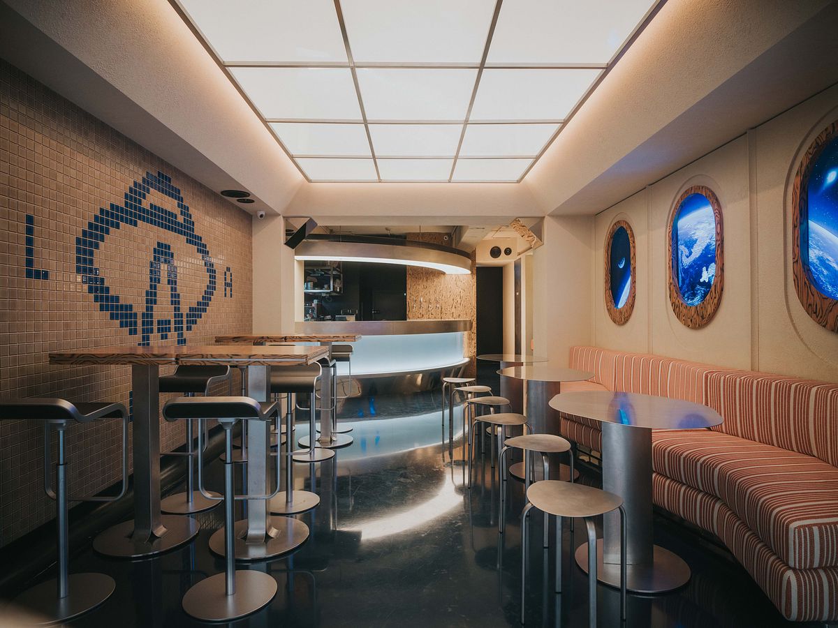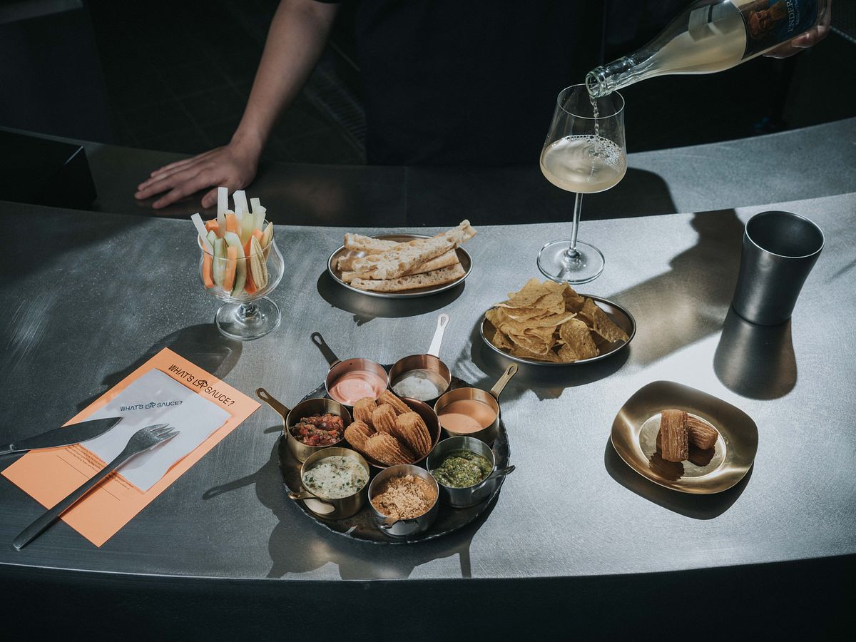 空間設計延續品牌混血視覺語言,以 飛碟(saucer) 為靈感,結合藍色金屬色調與未來感線條,打造好拍、好玩、好分享的社交場景,成為聚會、約會與夜生活的起點。酒水選品則涵蓋 精選葡萄酒、專屬雞尾酒與氣泡飲,風格橫跨美國、義大利與自然酒取向,設計為能與醬料與料理靈活搭配,讓風味探索不只停留在盤中,也延伸至杯中。
