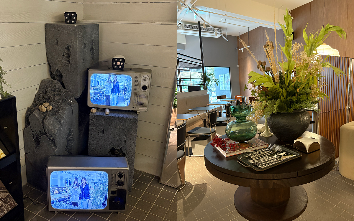 水湳門市空間由「不醒人室內裝修」操刀設計,以規律的方格地磚建立理性秩序,長型吧檯透過外露管線與沉穩木作,呈現「上輕下重」的視覺平衡。軟裝選用森林綠絨面吧檯椅,搭配質感抱枕,柔化金屬家具的冷硬感;燈光則特別挑選台灣設計品牌「柒木」的紙燈籠吊燈,柔和的光暈讓人一坐下來便自然放鬆。並透過連結內外的「都市綠洲」景觀設計,大面積透明玻璃將室外的礫石小徑、綠樹與長凳引入室內視覺之中,使空間彷彿擁有生命力,能自由流動、呼吸。設計上亦巧妙運用分區策略:在 Phase Coffee 沉穩內斂的客座區中,透過色彩語彙融入 DUM DUM 潮流且活潑的元素,讓溫潤木質、灰色混凝土與橘綠亮色系於同一空間內自然共存,完成兩個品牌之間的視覺平衡,也使空間本身成為品牌共創的一部分。