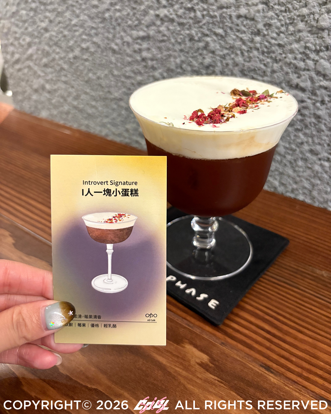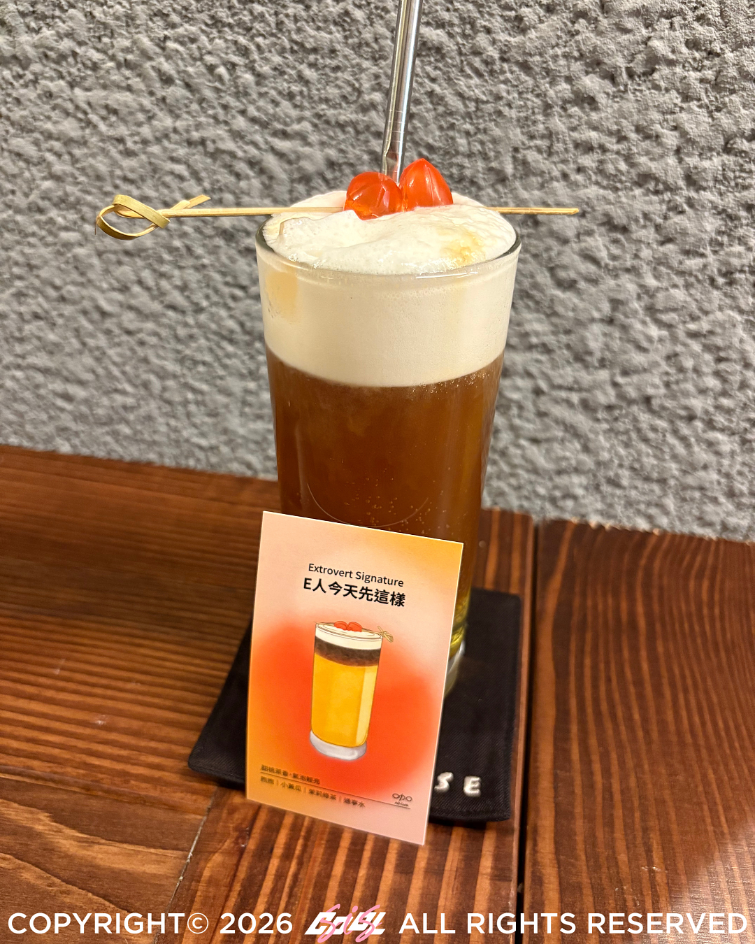 這杯特調看似低調,卻藏著讓人著迷的細節。首口是優格的清爽滑順,接著湧現莓果的明亮酸甜,最後留下乳酪溫潤綿密的餘韻。風味層層堆疊,如同 I 人的日常:慢熱真誠且感性細膩。這是一杯適合靜靜品味的飲品,宛如吃下一口內心深處的小蛋糕,溫柔而有重量,在安靜的片刻裡顯得格外耐人尋味。