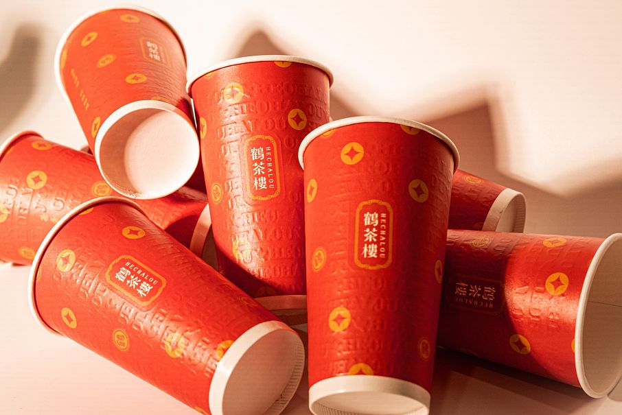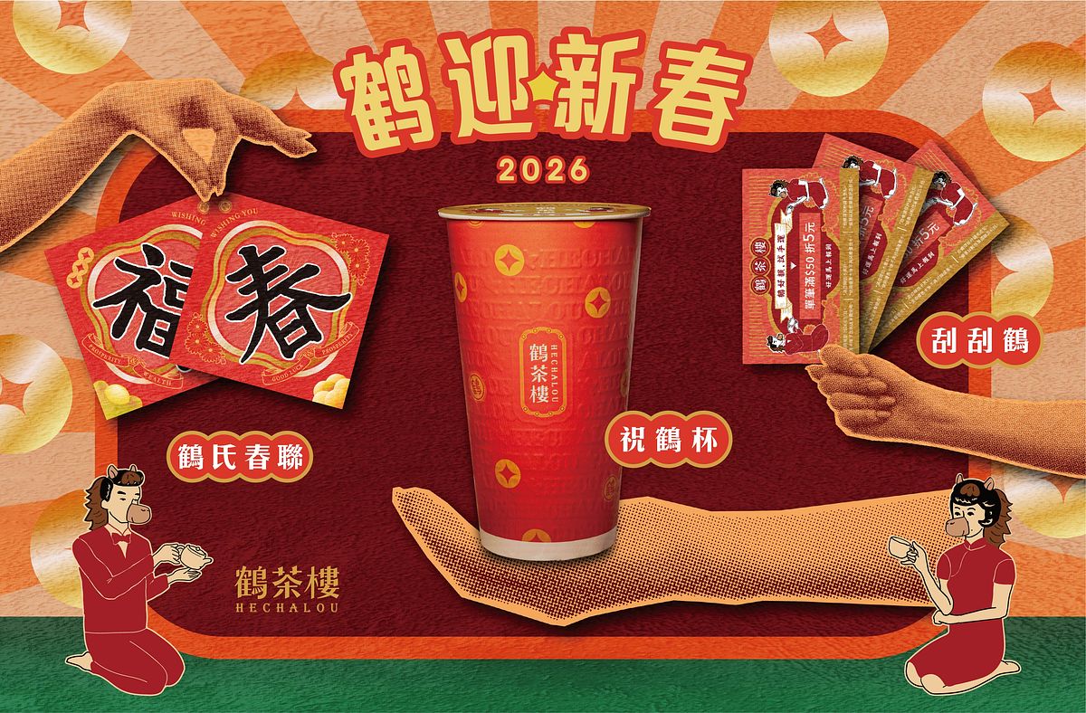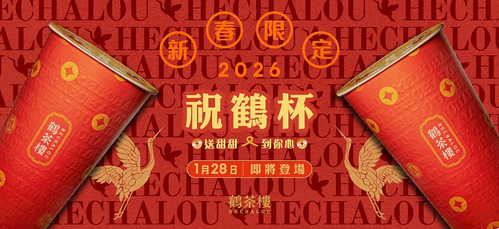 農曆春節將至,「鶴茶樓」首次推出應景新杯款「祝鶴杯」,杯身配色一改過去印象中的墨綠、及古銅色復刻色調,大膽的改以充滿喜氣的朱紅色作為整體主色調,並且杯身上的 HECHALOU 字母,以特殊加工的方式將字體以浮雕設計環繞於杯身,凹凸的字母象徵著熱鬧、繁盛的意象,其點綴於其中的銅色金幣,則意味著帶來吉祥與好運!原本復刻綠的封口杯膜也換上了古銅新配色,杯膜上的鶴氏男女吉祥物悄悄換上馬兒裝扮成了一大亮點!滿滿的祝賀之意融入本次新春杯款的設計中的每個小細節,透過日常的飲料杯、與享用杯中美好的飲料,在邁入春節前夕,鶴茶樓替大家補福氣、補好運。