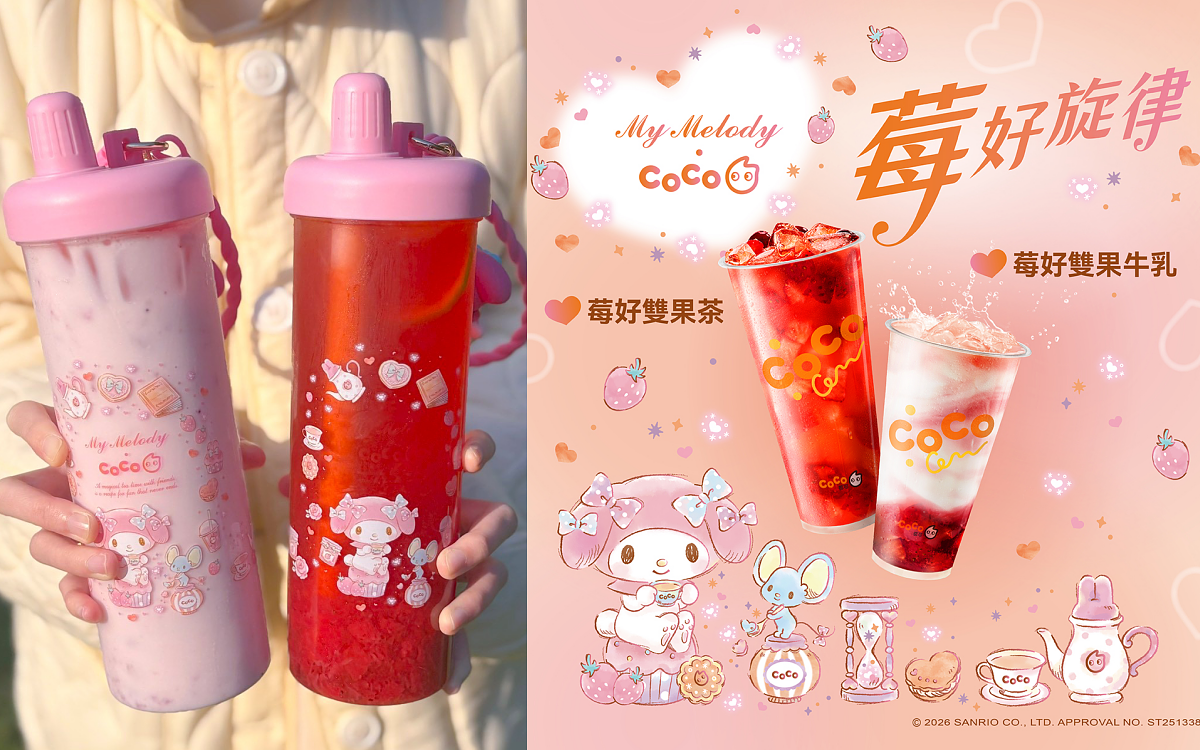 CoCo 與三麗鷗超級甜心美樂蒂(My Melody)與老鼠弗蘭多(Flat)攜手,推出夢幻聯名!粉粉嫩嫩的草莓系視覺,搭配酸甜「莓好雙果系列」飲品,還有一系列限量週邊可愛爆擊,包含:美樂蒂立體冷水杯、粉Q保溫袋、泡泡貼紙、聯名紙杯瞬間讓周圍充滿粉紅泡泡。另外這次聯名以草莓與蔓越莓雙果為主角,打造酸甜又清爽的夢幻飲品組合:「莓好雙果茶」酸甜清爽、莓果味十足,午後來一杯超療癒。「莓好雙果牛乳」則以莓果搭配牛乳,莓香柔順且無咖啡因,小朋友大朋友都能喝,甜美幸福感爆棚!全系列莓果採用 HPP 冷高壓滅菌技術保留營養與果香,讓你喝得安心也喝得開心!