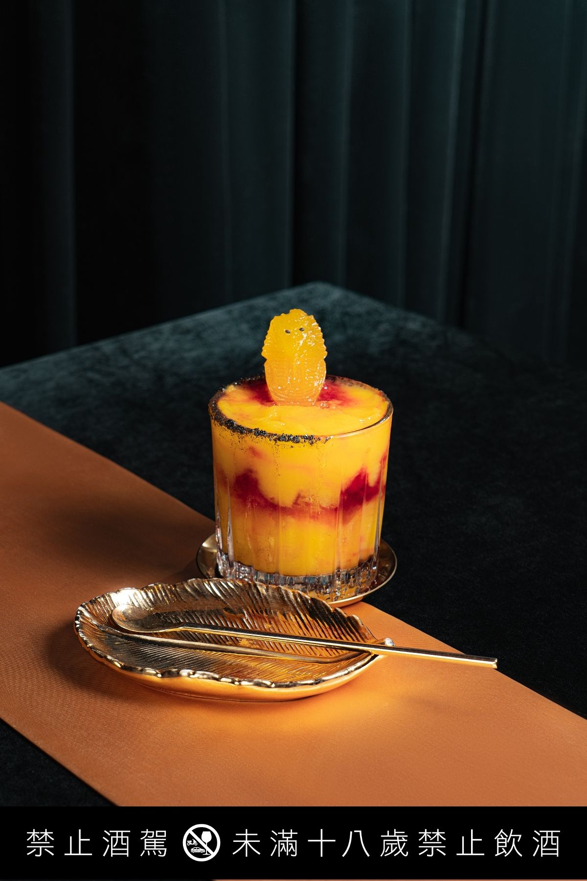 以象徵埃及的木槿花為靈感,融合熱帶芒果的酸甜果香,酒體柔順、層次鮮明。杯中法老造型芒果冰塊隨著融化,映照出如尼羅河畔日落般的溫暖色澤,在花果香氣與酒感之間取得平衡,為夜晚增添一抹成熟的異國浪漫。