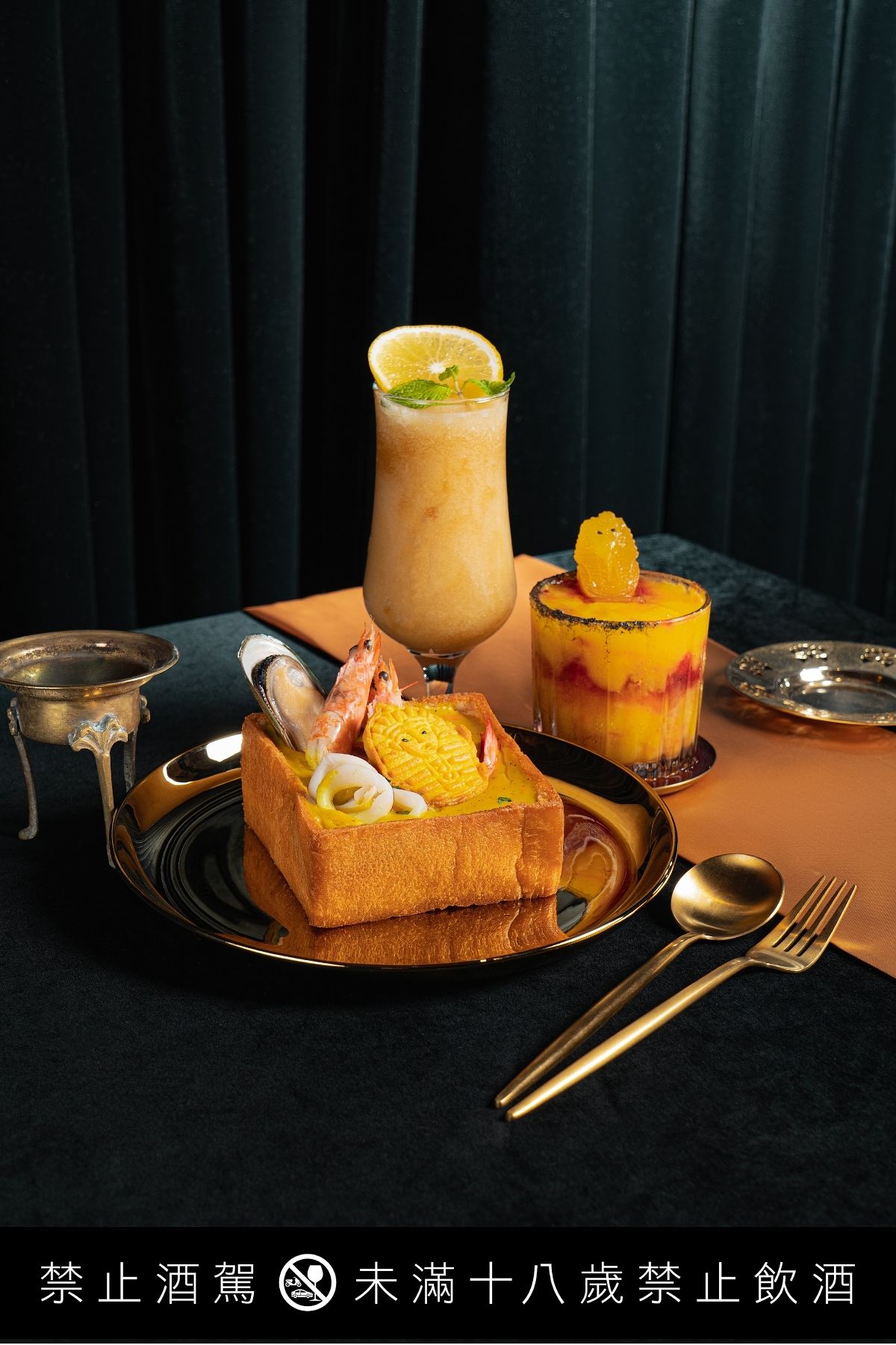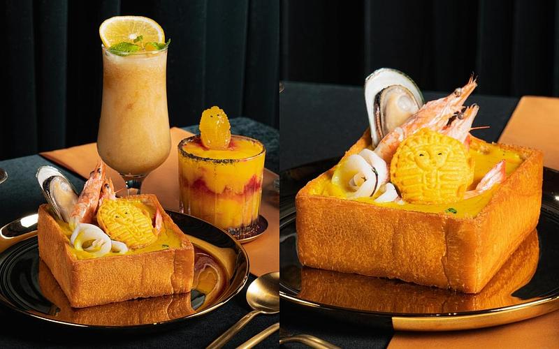 以奇美博物館所在地台南的經典小吃「棺材板」為創作基底,厚切吐司盛裝香料海鮮濃湯,鮮甜海味交織異國辛香,口感濃郁、層次豐富;搭配法老王造型黃金餅乾,將古埃及意象轉化為趣味視覺巧思,為餐桌開箱一場跨文化的味覺冒險。