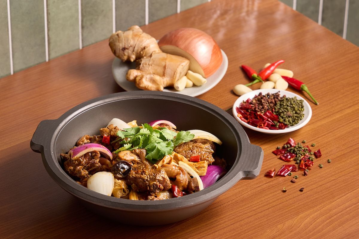 同為招牌主鍋的「港式雞煲」,強調先乾吃、後涮煮的「一鍋兩吃」饗宴,是受到許多香港食客喜愛的特色鍋物,主廚首先將蔥、洋蔥、蒜頭與二荊條辣椒等多種辛香料下鍋爆香,隨即放入切塊的半隻鮮嫩仿土雞,待乾煎至表皮金黃、鎖住肉汁後,再加入濃郁高湯及混合牛油、豆瓣醬與十餘種中藥材耗時製作的獨門秘製醬汁調味,最後在起鍋前嗆紅露酒增香,整體醇厚香辣、帶有迷人藥膳香與圓潤感。開鍋後可先享用飽吸醬汁的乾鍋嫩雞,更可遵循香港風格,加入大量香菜增香,更顯美味!享受第二吃,則可再於雞煲內注入濃香高湯,化身為鮮甜麻辣的港式火鍋,涮煮手工現切溫體牛、海味食材或當季時蔬都是極致享受。