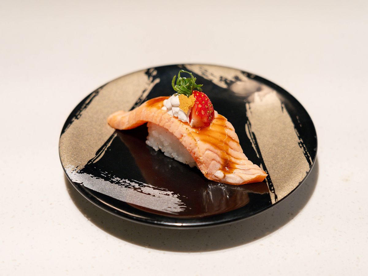主打戀愛運的「甜甜戀愛草莓鮭」,以粉嫩草莓與炙燒鮭魚將愛情的粉紅泡泡給具象化,酸甜果香與鹹香油脂於舌尖完美交織