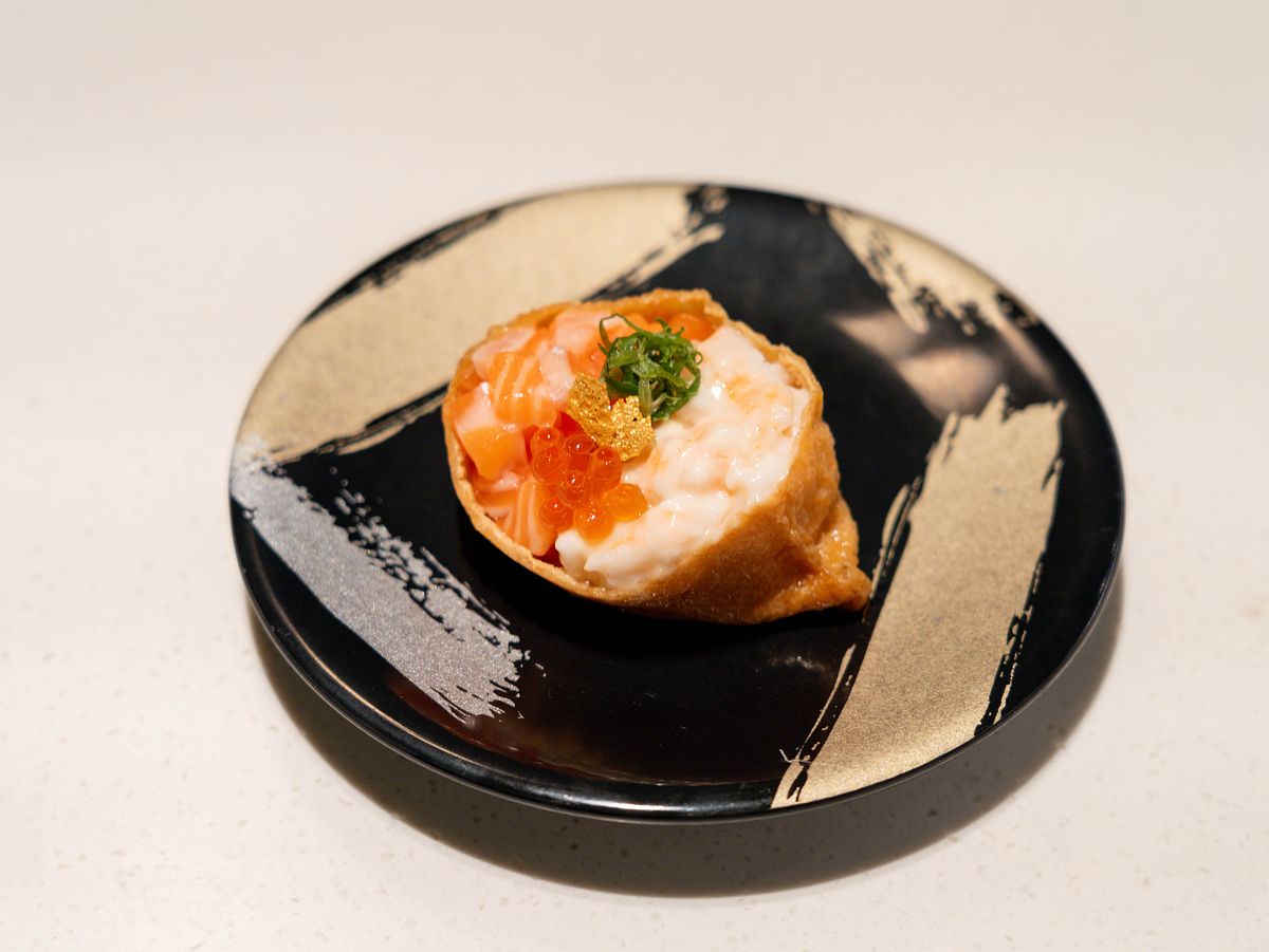 代表平安健康的「一帆風順鮭蝦配」,基底的稻荷壽司宛如一艘滿載祝福小船,鋪上鮭魚肉並拌入新鮮蝦肉,具有出入順遂、平安「鮭」來的美好寓意。