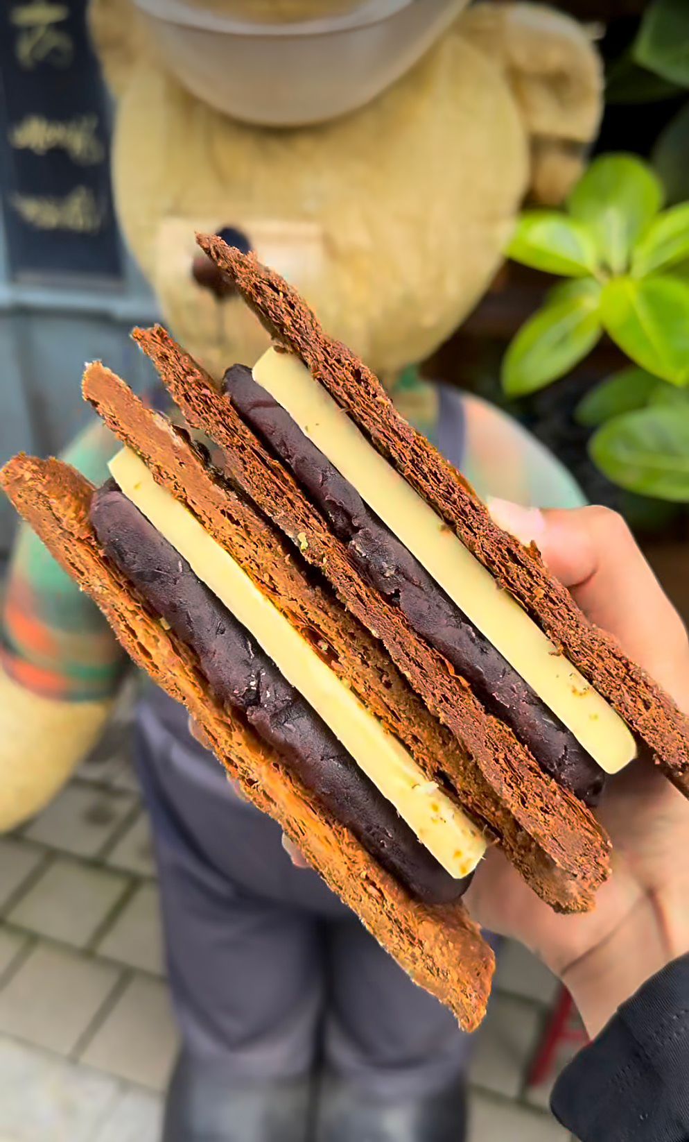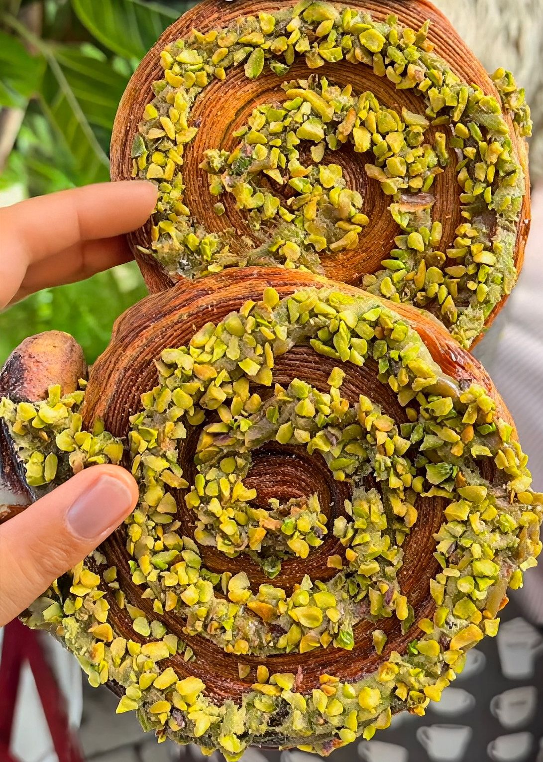 四大產品線中經典可頌的口味選項包括杜拜巧克力、杏仁奶油、瑪格麗特、美式臘腸,其中「杜拜巧克力可頌」是擁有華麗外型與濃郁內餡的品牌人氣代表,層層酥皮包覆濃厚堅果與巧克力餡料,切開瞬間可見餡料與麵體交織的豐富剖面,濃厚堅果油脂香與微苦可可風味相互平衡,既濃郁又不厚重,極具視覺張力的外型也成為韓國年輕族群熱愛的社群打卡款。
