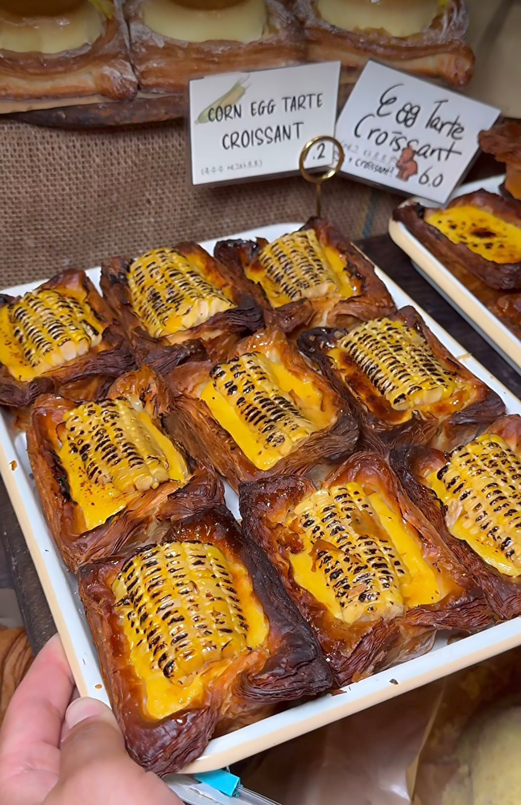 法式焦糖奶油酥推出開心果和經典原味二款,「開心果法式焦糖奶油酥」有著覆上輕薄焦糖的酥脆外層,以及裹入滋味濃厚、質地絲順的開心果奶油,從酥、鬆到滑的口感轉換清晰鮮明,是甜點愛好者推薦的進階風味選擇。蛋塔類品項則有經典原味和極具視覺效果與口味創意的「炙烤玉米可頌蛋塔」,整片炙烤過的玉米覆蓋香甜的蛋塔內餡,口感豐富且充滿驚喜,預料將成為本次快閃的排隊亮點。酥脆扁可頌的口味選項有紅豆奶油、香濃可可二款,台灣消費者可以零時差的品嘗到這款被暱稱為「可頌鍋巴」的極致酥脆滋味。