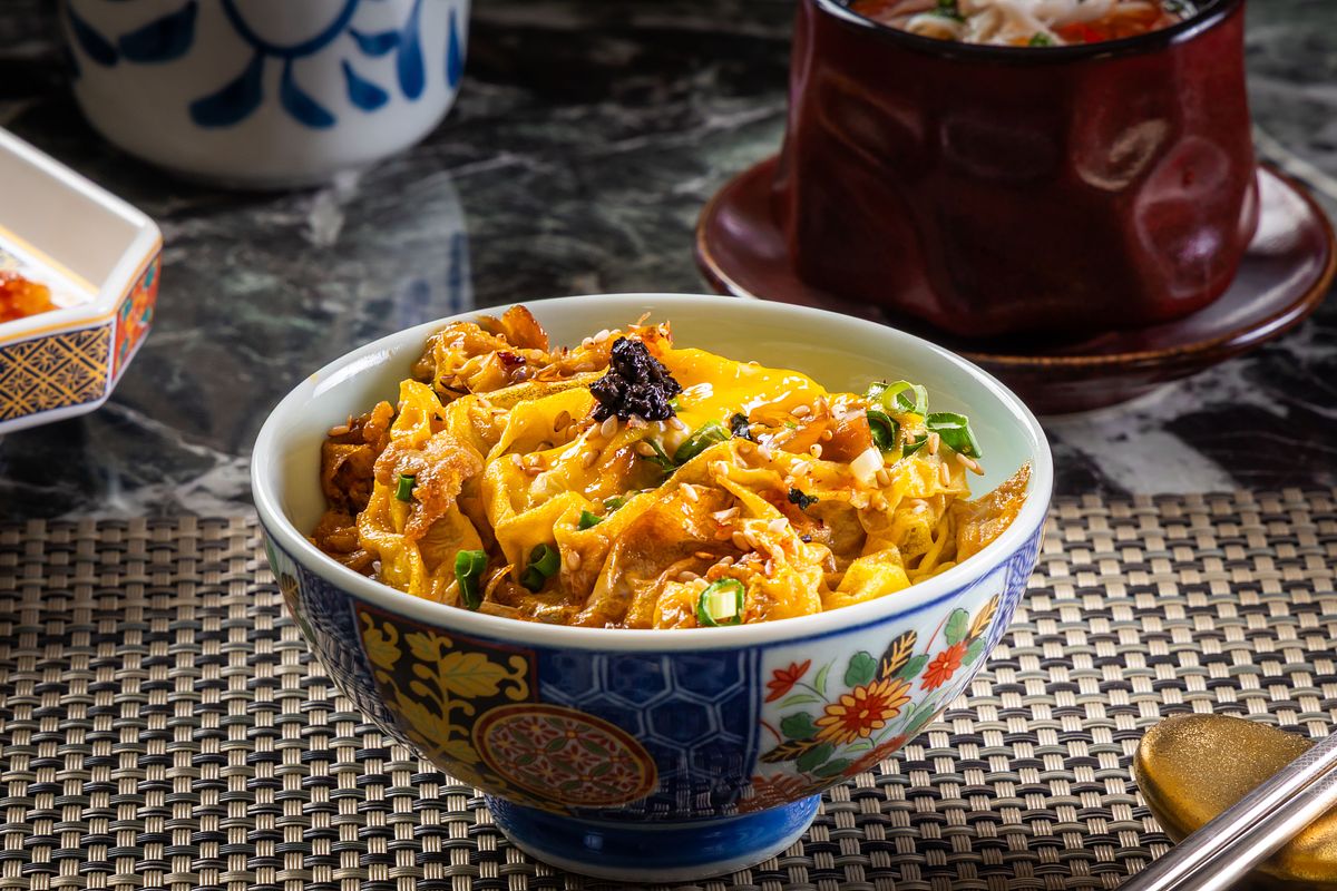 餐期最後,專人桌邊料理的「京都祇園松露滑蛋蓋飯」將風味精華濃縮於一碗中,松露醬與蛋液輕柔交融,撒上蔥花、日本香鬆與福神漬,澆淋在熱騰騰的米飯上,每一口都滑潤香醇,回味無窮。