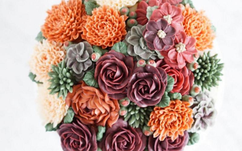 這些蛋糕上點綴的花朵都是用奶油製作而成,巧妙的運用便能成為這副花團錦簇的美景。而且深色的花朵讓蛋糕更有分量感,裝飾起來非常華麗漂亮。