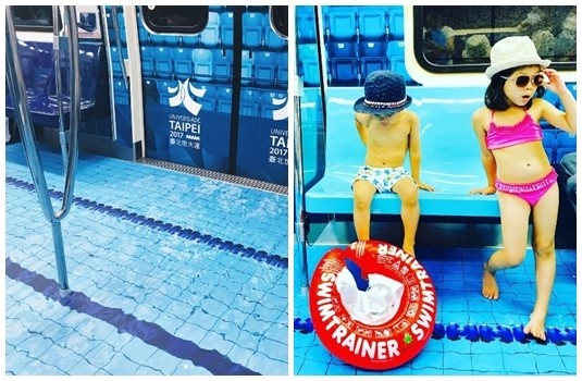 這次彩繪列車最讓大家驚喜跟印象深刻的,就是「游泳池」的主題車廂,逼真到讓人以為真的身在泳池了呢,每張照片都像3D一樣!還有人打趣地說,在外面走動快被太陽熱暈,一進車廂就像跳到游泳池,一秒就消暑超清涼~踩在捷運地板上就好像泡在水裡,絕對要往下拍一張PO上網!(也有人好用心打扮去拍照~哈哈!
