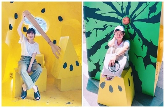 而走進商場內,1F的室內裝潢也一併變成小玉西瓜世界,充滿十足台灣在地風情,又充滿夏天氛圍,還非常讓人感覺清涼消暑~內部不只牆面改造了,連樓梯也變成黃黃綠綠的西瓜造景,也有大型的湯匙叉子可以拿來互動拍照~讓女孩少女心噴發~好好拍!