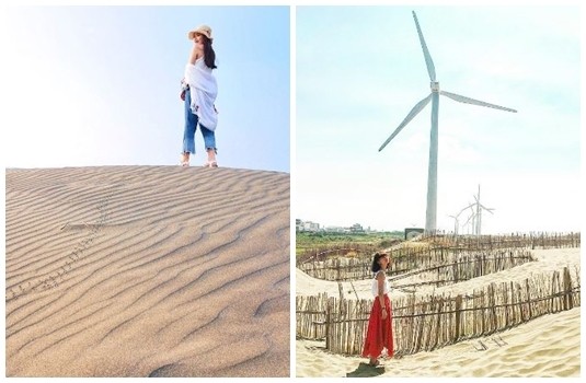 不只有大片的沙丘十分壯觀,這邊還有風力發電的大風車,可以調整一下拍照角度,讓超大風車、綿延的竹圍籬都入鏡,就瞬間從中東的沙漠變換到充滿台灣西部特色的超美風景,有一種飄渺的蕭瑟感~也可以讓山丘下的沙岸海邊入鏡,衝突的畫面真的太特別了!