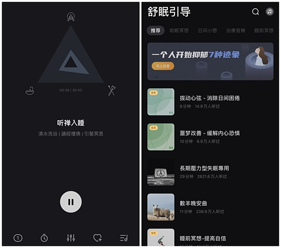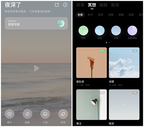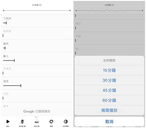 在小睡眠中最多可以自己選三種白噪音進行混搭,也能自行混音,創造出適合自己的白噪音。比較特別的是「真人哄睡」與「睡眠小電台」,是由不同助眠師親自講故事,搭配輕柔音樂來引導妳進入夢鄉。如果是午休時想使用白噪音,很推薦小睡眠,因為有特別開設「小憩」與「午休」的選項,裡頭也有很多不同的預設場景可以快速挑選。但缺點是APP裡面會有簡體字,但是多看就會懂了!