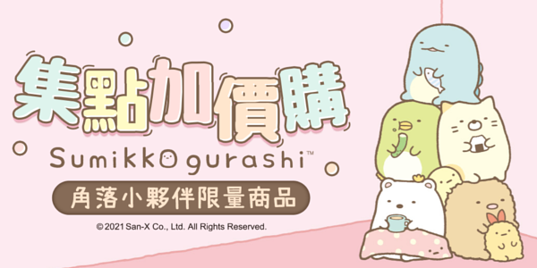 2. 活動期間可依照指定時段前往活動頁面登記換購「角落小夥伴」周邊單品折價券,後可於折價券指定歸戶日期使用折價券加購該商品,逾期恕不補發。
