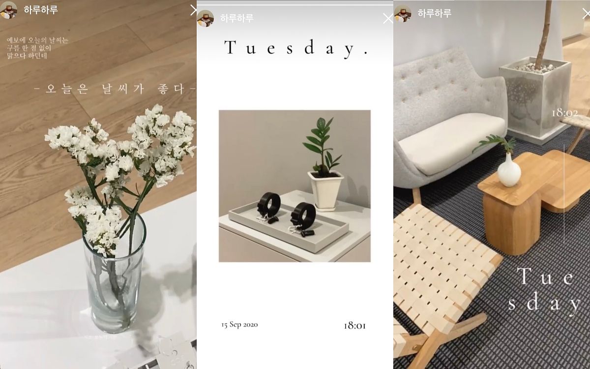 韓文字裝飾超有質感,左圖一排字意為「今天天氣很好」、可以用在任何時刻,而且除了韓文字也有星期的英文字互相搭配,排版簡單又有一點設計細節,多款版型可以挑選。
