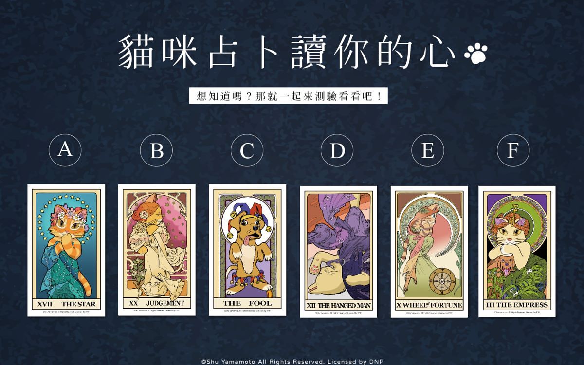 本次搶先公開22張中的6張公仔限定塔羅卡牌:貓星、貓的審判、愚者貓、吊貓、貓的命運之輪、貓皇后,不同的卡牌將對應測驗者不同的個性特質,在居家防疫期間,就讓「貓咪占卜」為你舒緩煩悶的心靈,想知道自己隱藏的個性是什麼嗎?就繼續看下去吧!
