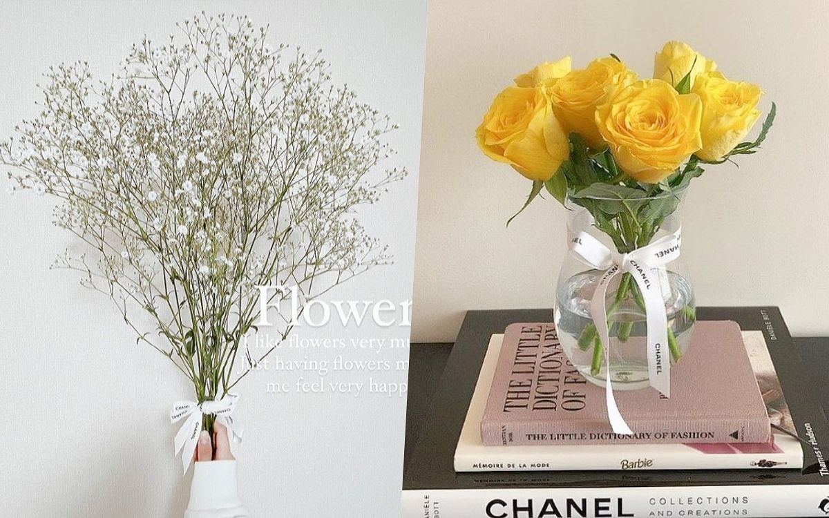 最基本的全透明花瓶跟精品緞帶搭配超完美!而且不管什麼顏色的花束都很適合。