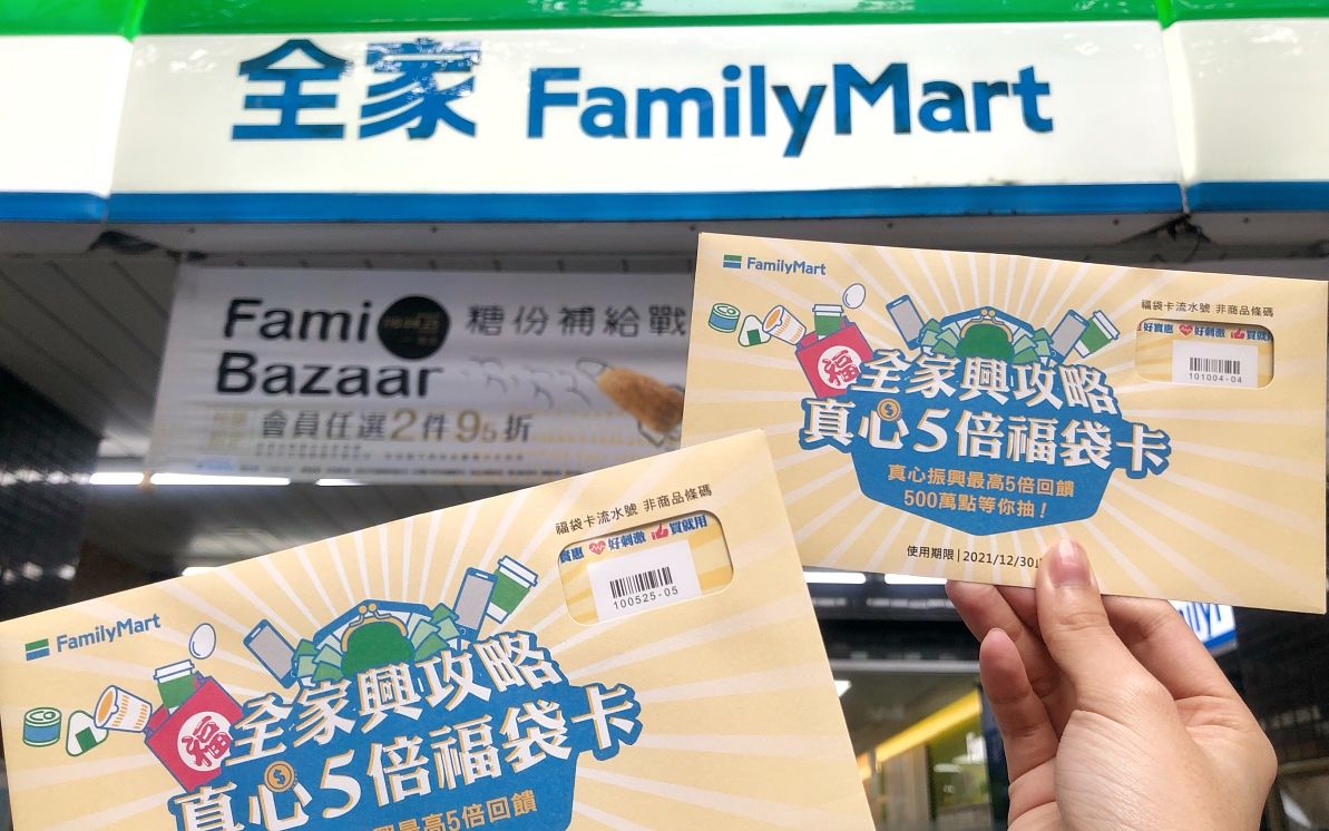 福袋卡:另外即日起至10/12推出穩賺不賠的「真心5倍福袋卡」,每張售價500元,限量10萬組。福袋卡享有雙重優惠:內含三種隨機優惠,購入即可獲得550元購物金,等於立馬現賺10%優惠,其次為600元購物金,最高可翻5倍獲得2,500元購物金;第二重優惠憑卡面QR-Code登錄活動頁面還有機會抽「全家」點數500萬點(5名)。