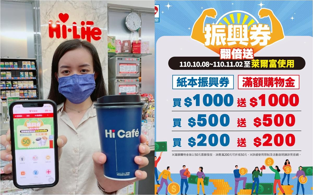 萊爾富響應政府政策,推出振興五倍券預訂、領取與使用優惠,即日起,民眾到全台萊爾富完成數位共同綁定、預訂或領取紙本五倍券,即享Hi Café大杯美式咖啡或大杯拿鐵咖啡同價格買一送一。此外,萊爾富也禮遇選擇在萊爾富領取紙本券的民眾,除享有指定咖啡買一送一的優惠外,再加碼送滿額購物金50元(消費滿300元即可使用)。