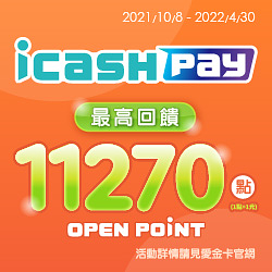 即日起~2021/12/31期間使用icash Pay、icash2.0於指定通路特定日消費享OPEN POINT點數10%回饋