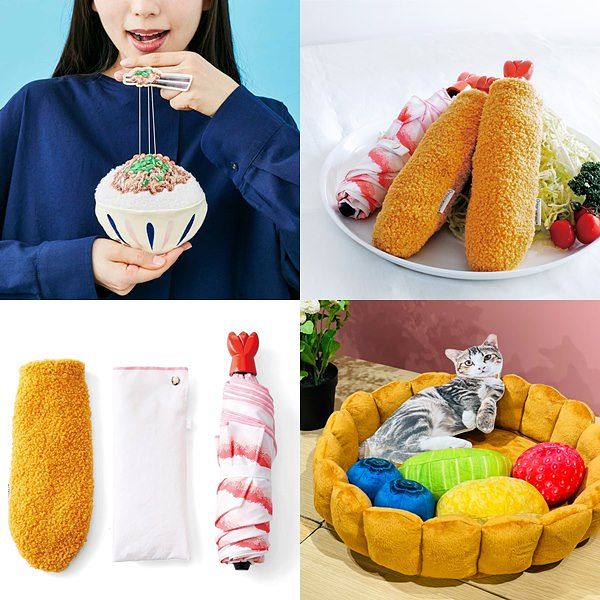 特展匯集逾百件浮誇系「和食主題」生活雜貨選物,像是「超蝦」設計「炸蝦折疊傘」,逼真還原肥美酥脆的炸蝦天婦羅,脫下金黃酥脆的外皮傘套,鮮嫩蝦肉傘面搭配蝦殼造型手把,惟妙惟肖的設計令人會心一笑!日本喜愛超級食物納豆也能延伸於生活雜貨,「納豆配飯加蔥花的造型票卡夾」伸縮線設計完整呈現納豆黏稠牽絲的特點,實在創意十足!放大的「水果塔貓窩」、「餡蜜貓床」則讓毛孩一秒變甜點,咖啡色的塔皮、五顏六色的水果餡料,趣味造型專為貓咪設計,療癒指數滿分!