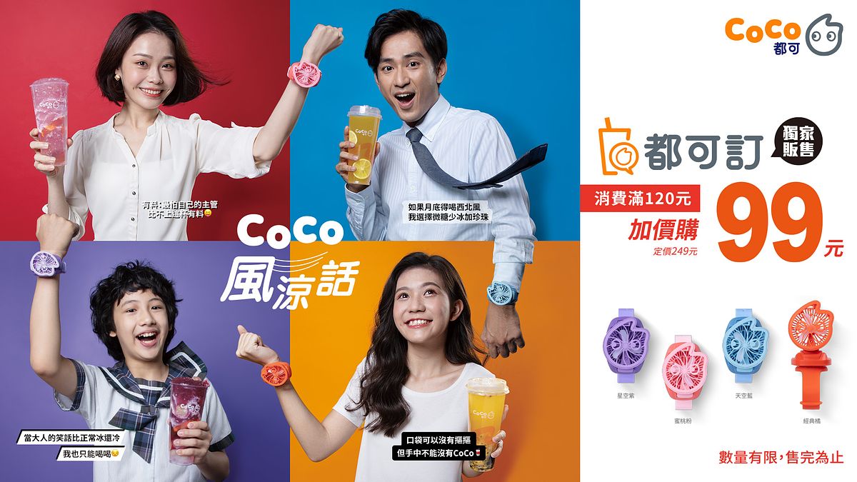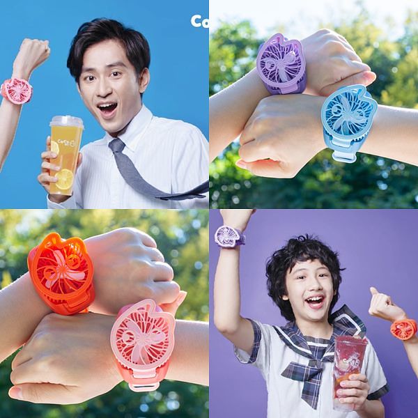 CoCo玩出「新」意,繼造型可愛周邊商品「奶茶包」後,再推出「Co娃造型手錶風扇」,在初秋微風徐徐時,吹入你的心坎裡,10/4起至CoCo都可訂線上點單飲品消費滿額120元,四色造型手錶風扇加價購只要99元,數量有限,售完為止。