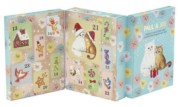 廣受喜愛的 PAUL&JOE 倒數月曆又來臨了!外盒與內盒設計有品牌設計師Sophie的兩隻愛貓Gypsy與Nounette相親相愛一起慶祝聖誕節的模樣,也結合了PAUL & JOE品牌象徵的西洋菊、與各種代表聖誕節慶的可愛小物。共24格,包含PAUL & JOE明星底妝與保養品項、限量彩妝正貨、限量化妝包與飾品。