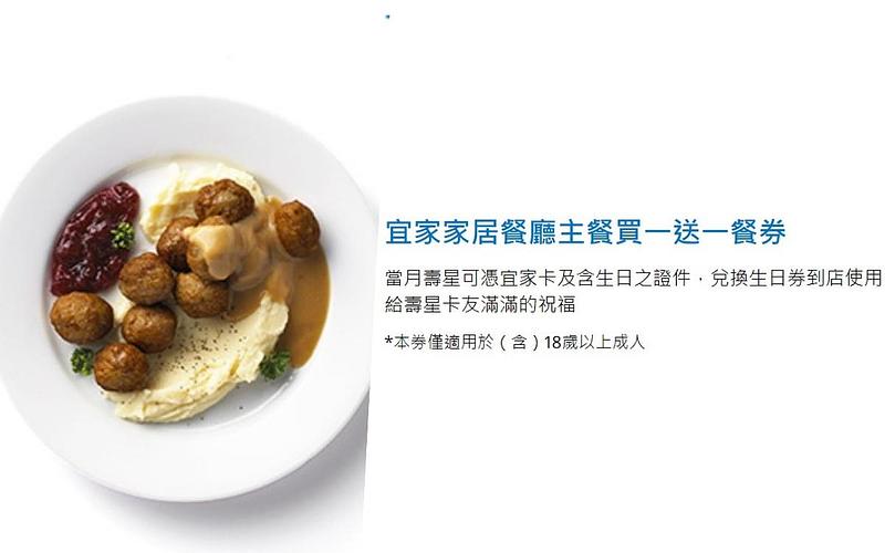 宜家家居餐廳主餐買一送一券,適用於18歲以上成人。