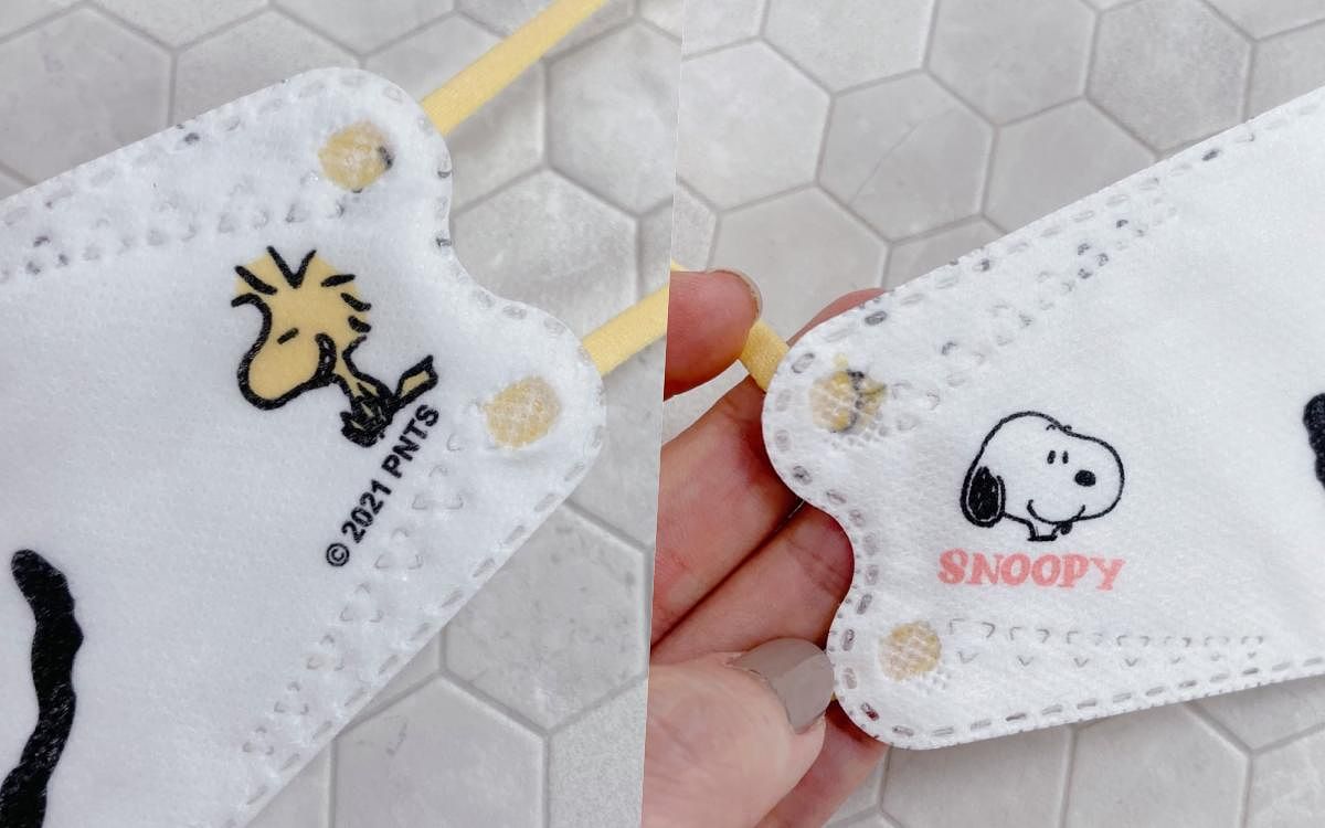 除此之外,立體口罩的上方為滿版史努比圖案拼接,上面的每一個史努比都不一樣,光看都覺得療癒!