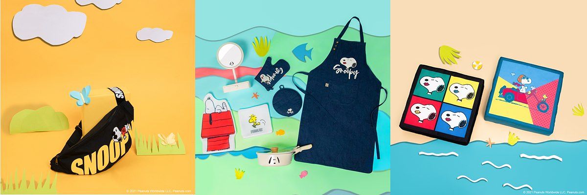 推出時尚兼具實用的「SNOOPY潮玩藝術丹寧圍裙」、「SNOOPY潮玩藝術丹寧隔熱墊組」以及廚房不可或缺的「SNOOPY史於經典鍋具三件組」讓你做菜好心情,完美眼妝就靠「SNOOPY史於經典LED抽屜美妝鏡」,「SNOOPY史於經典洗衣袋兩件組」多功能用途,也可以當旅行收納袋使用。