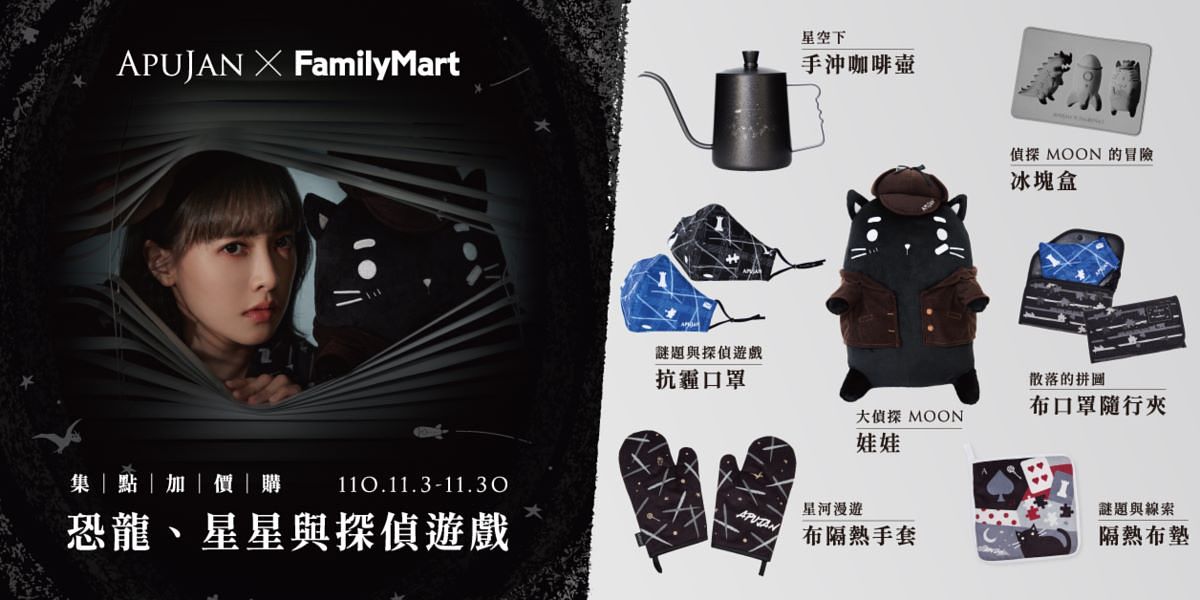 在後疫情時代,追求高質感、具有個人品味的居家生活環境趨勢上升,全家便利商店再度攜手時裝品牌APUJAN,推出「恐龍、星星與探偵遊戲」聯名系列,設計一系列帶有奇幻時裝元素的廚房用品;包含帶有 APUJAN 品牌元素的冰塊盒、隔熱布手套、隔熱布墊、手沖咖啡壺等,更再次推出新款的 MOON 絨毛娃娃,成為居家良伴首選。