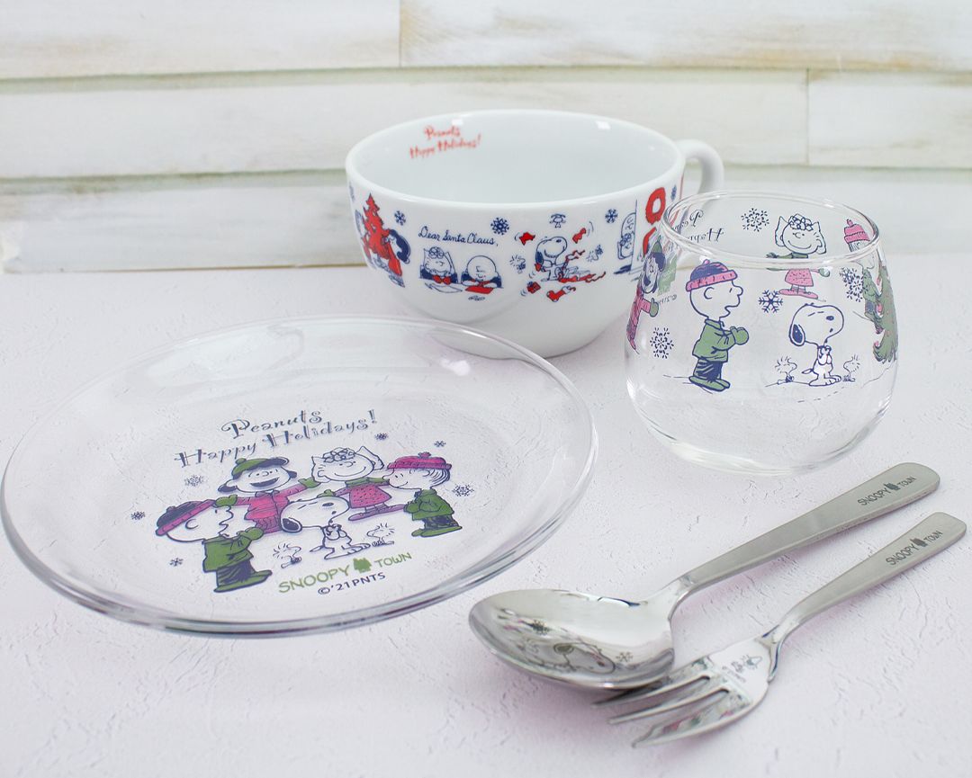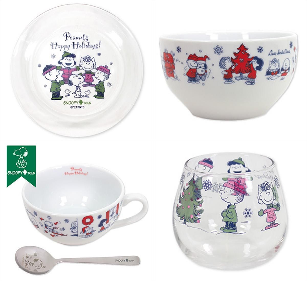 有了廚房小物,當然也要配上餐具才行啊!這次共有玻璃點心盤組、湯杯組與不倒翁玻璃杯三款商品,圖案為花生家族們一起歡樂過節的模樣,光看都忍不住會心一笑!