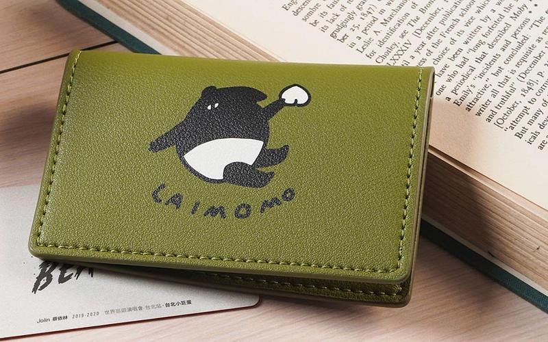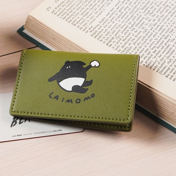 墨綠襯底配色搭配黑白插畫呈現低調時尚感。對折掀蓋設計,上下層皆能收納名片、鈔票。合成皮革材質輕攜手感佳、時尚耐用。