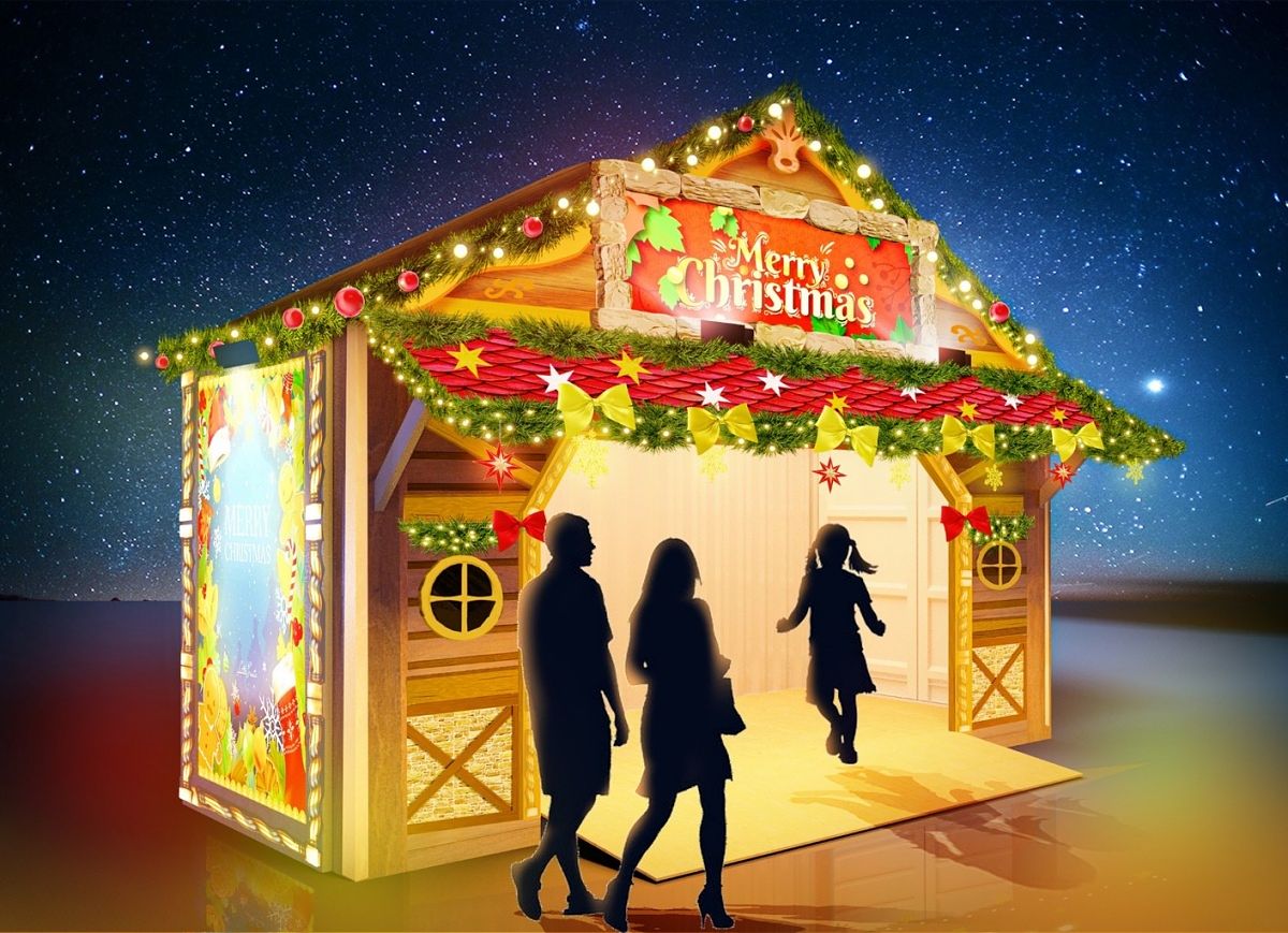 以小木屋元素設計,搭配槲寄生、耶誕燈飾等元素裝飾,夜晚以外打光形式發亮。