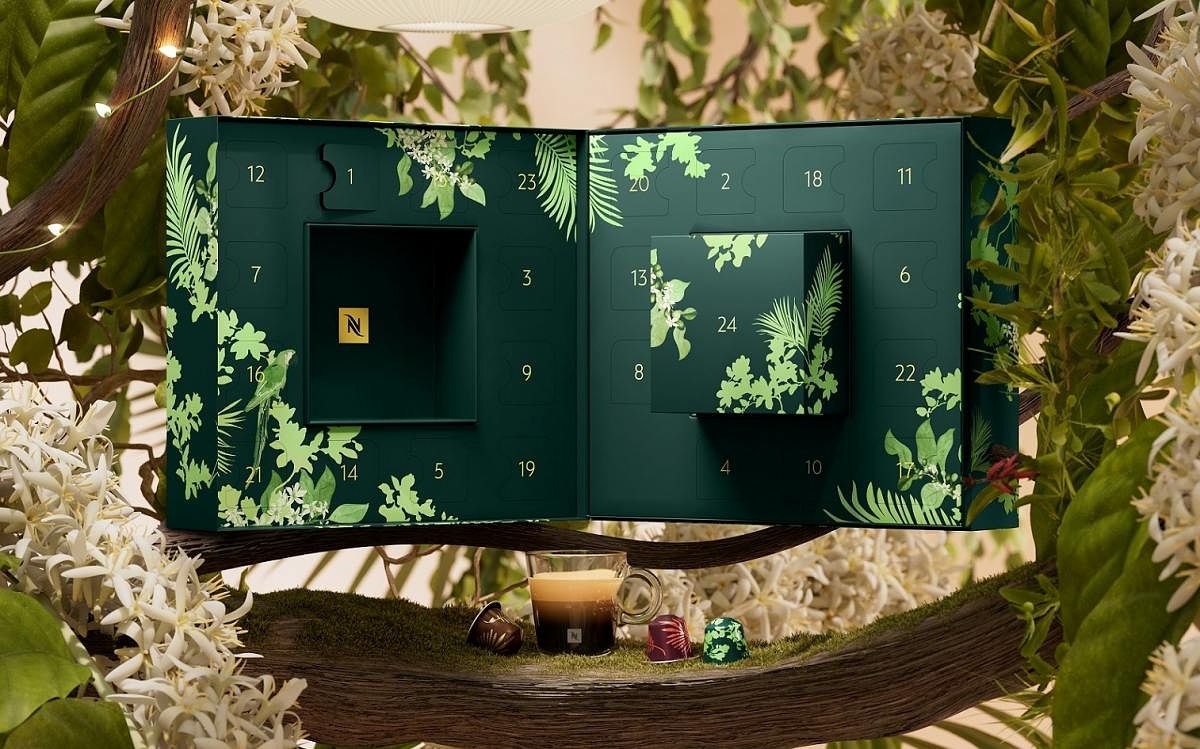 Nespresso今年推出全新「森林之心耶誕倒數月曆」,以永續代表色—綠色作為襯底,象徵著寧靜、平衡及森林的生生不息,運用繚繞的藤蔓及珍稀鳥禽遍佈盒身,感謝森林馥郁的滋養。每一個小巧的方格中都藏匿著Nespresso精心巧思,23種不同口味的咖啡膠囊,第24天倒數最後一日更有一份驚喜大禮 – 耶誕限定咖啡杯,為咖啡愛好者帶來最頂級的咖啡饗宴,以雀躍的心共同迎接佳節!