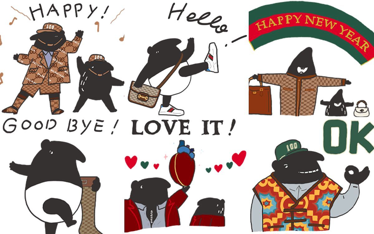 身穿當季時髦服飾,搭配經典的Horsebit 1955包款和優雅的Gucci Diana托特包、竹節手提包的馬來貘LAIMO,展現出不同以往的時尚面貌。甚至可以看到馬來貘LAIMO穿上最新的The Hacker Project服飾、頭戴Gucci 100紀念帽動感起舞。這波動態貼圖除了常用的招呼語「Hello」、「Thank You」、「OK」、「Good Bye」;更多了濃濃節慶氛圍的圖案:「HAPPY」、「PERFECT」、「LOVE IT」、「HAPPY NEW YEAR」。