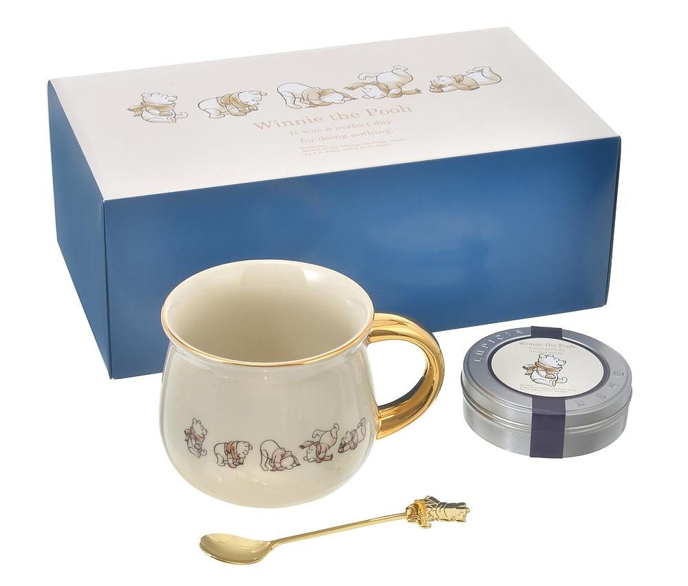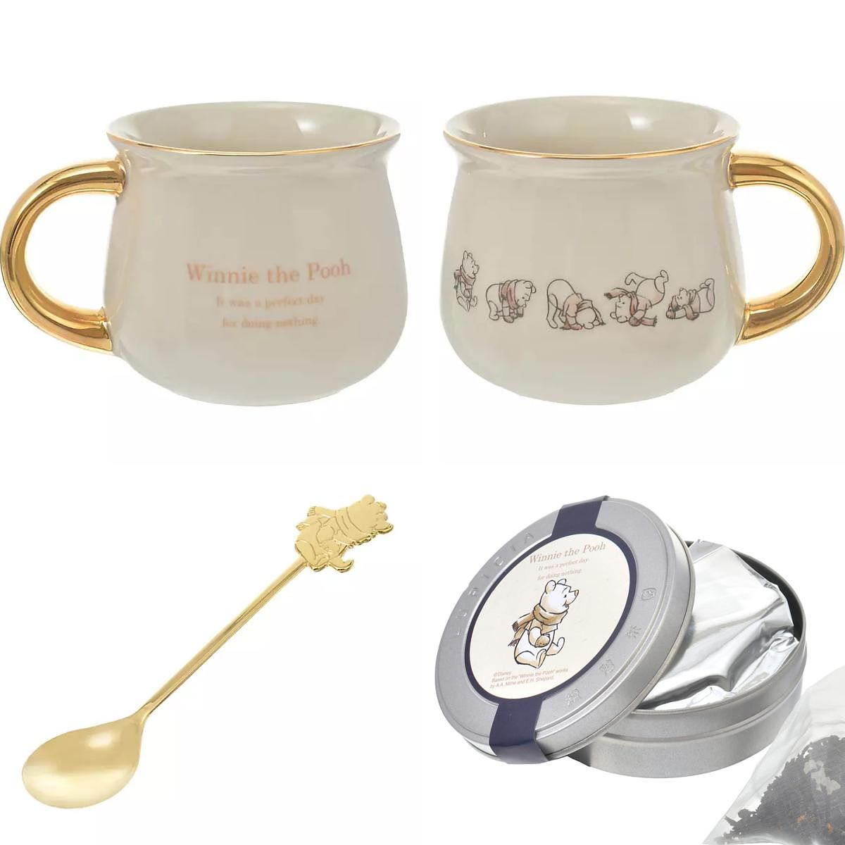 與知名茶葉品牌「LUPICIA」合作推出的紅茶組合,外包裝是小熊維尼的禮盒造型(而且維尼在可愛地翻滾啊),禮盒當中是一盒焦糖核果口味的紅茶與精緻的杯匙組。